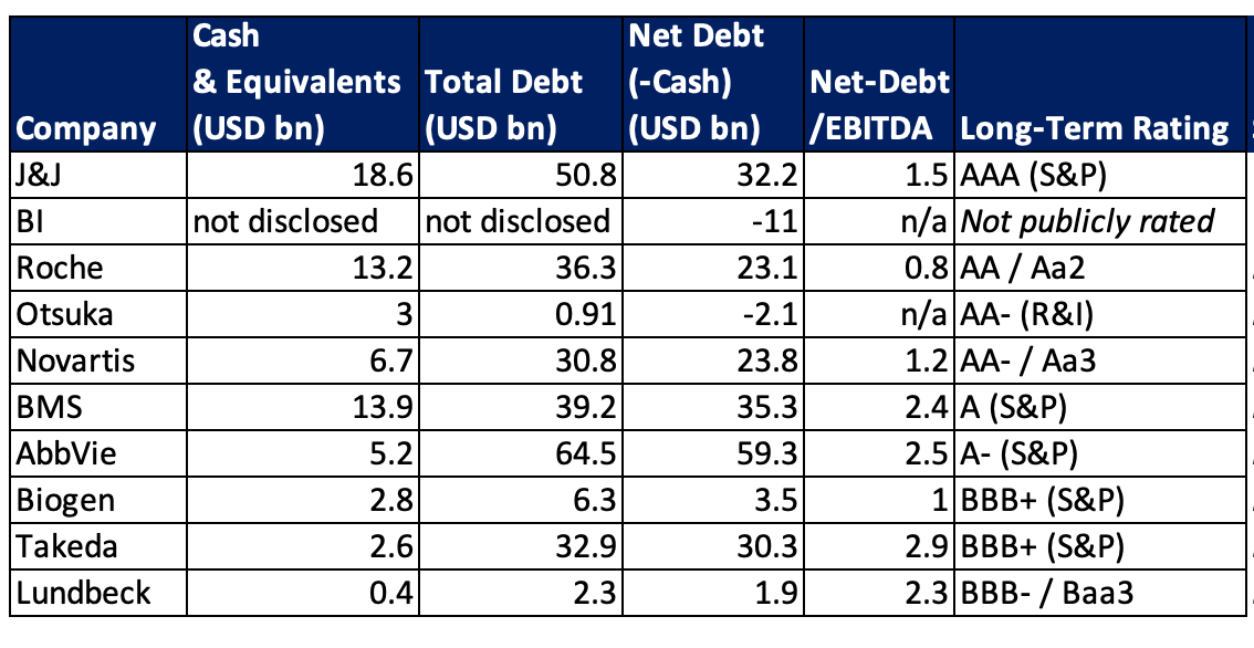 All the listed companies have in principle the financial capacity – in varying degrees – to execute a $1 billion-plus acquisition in the next 6–12 months. J&J, Roche, Novartis, Otsuka, Biogen, and Boehringer Ingelheim have substantial liquidity or net cash positions and strong credit ratings, making a $1bn+ deal comfortably feasible. AbbVie, BMS, and Takeda carry higher debt loads, but their large cash flows and investment-grade ratings suggest that a $1bn acquisition is still likely manageable (though these firms may be more debt-sensitive and thus prudent in structuring such a transaction). Lundbeck, while financially stable, has the tightest headroom due to its recent leverage increase; it could pursue a $1B deal, but would probably need external financing or partnering to maintain balance-sheet health. Below graph ranks the companies from high to low $1bn+ deal headroom.