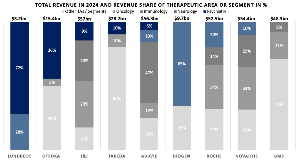 What jumps out: In 2024, only three companies generated more than a third of their revenue from neuropsychiatry: Lundbeck (72 % Psychiatry, 28 % Neurology) and, at a very different scale, Otsuka (36 % Psychiatry) and Biogen (65 % Neurology). Everyone else was in the single-digit to low-teens range, meaning psychedelics would be either a bolt-on (for the CNS specialists) or a diversification move for the larger immunology and inflammation- as well as oncology-heavy groups.