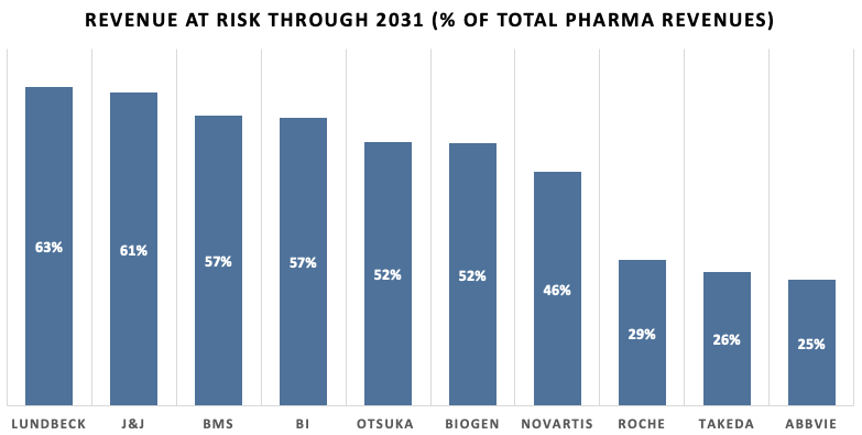 When, as a next step, looking at pharma revenues at risk due to loss of exclusivity through 2031, the left side of the chart below is dominated by companies whose neurology / psychiatry or immunology franchises hit the patent cliff first. CNS-only player Lundbeck tops the list (63% of sales at risk) because its once-monthly antipsychotic Abilify Maintena already lost exclusivity with generics expected to erode revenues quickly, and antidepressant Trintellix follows in 2026–27. J&J (61%) is close behind: blockbuster Stelara faces U.S. biosimilars from February this year, while Xarelto (2025-26), Darzalex (≈ 2028) and shared oncology asset Imbruvica (≈ 2028) line up next. BMS and BI (both 57%) owe their high percentages to a single mega-drug: Eliquis for BMS (generic entry April 2028) and Jardiance for BI (key patents lapse 2025, with generics already multiplying in India). Otsuka and Biogen (52%) each hinge on psychiatry and neurology respectively: Otsuka’s risk is the same Abilify Maintena cliff as with Lundbeck plus possible tolvaptan erosion after 2026, whereas Biogen’s exposure centres on Tysabri, whose first biosimilar (Tyruko) is FDA-approved and could launch once remaining patents expire in 2027.