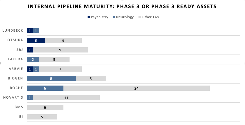 Roche towers over the field with a diverse set of an remarkable 30 Phase 3 or Phase 3-ready projects in total, including six in neurology and 24 in non-CNS areas, confirming its status as the broadest internal pipeline among large pharma. Biogen, by contrast, is highly concentrated: its eight neurology assets (e.g., sub-cutaneous lecanemab for Alzheimer’s, tofersen for ALS and prasinezumab for Parkinson’s) give it the largest pure-neuro late-stage portfolio, while activity outside the CNS is minimal. Otsuka stands out in psychiatry with three active Phase 3 programs (brexpiprazole for PTSD, the TAAR-1 agonist ulotaront for schizophrenia, and centanafadine for ADHD), more than any other company on the list. The former, Brexpiprazole, however recently experienced a setback - with a 1-10 negative vote the FDA Advisory Committee did not recommend brexpiprazole with sertraline for PTSD due to insufficient efficacy evidence. At the opposite extreme, both BMS and BI are pursuing only non-CNS indications at this stage, reflecting their historical focus on oncology, cardiovascular and metabolic diseases.